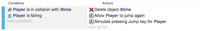 In the example below, GDevelop checks if the player has landed on top of a slime. If so, it deletes the slime and makes the player initiate a jump which gives the effect of bouncing on top of the slime.